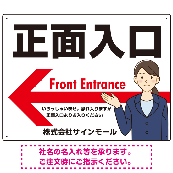 正面入口 スーツ女性イラストデザイン オリジナルプレート看板 左矢印 W600×H450 アルミ複合板 (SP-SMD583L-60x45A)