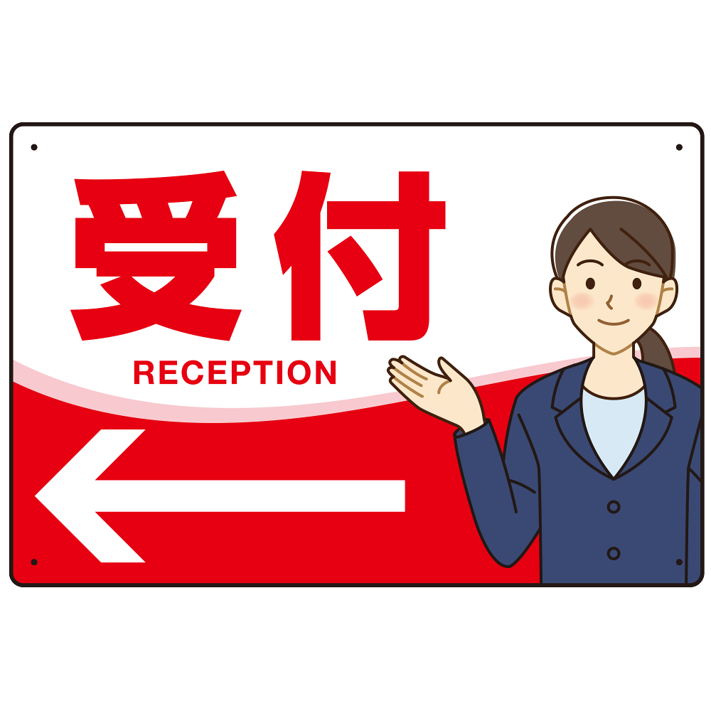 商品説明:会社・工場・オフィス向け受付案内 矢印付 女性イラストデザイン オリジナル プレート看板 レッド/左矢印 W450×H300 エコユニボード (SP-SMD588AL-45x30U)
