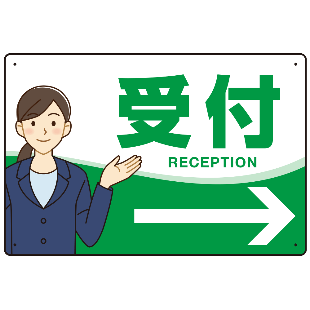 商品説明:会社・工場・オフィス向け受付案内 矢印付 女性イラストデザイン オリジナル プレート看板 グリーン/右矢印 W450×H300 エコユニボード (SP-SMD588CR-45x30U)