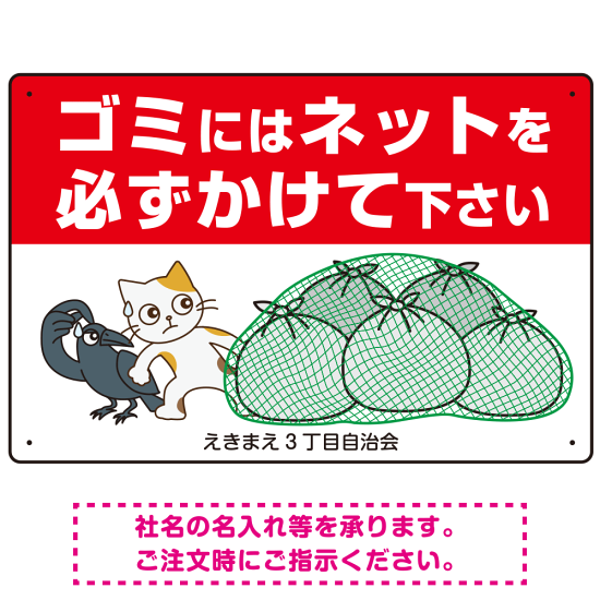 ゴミにはネットをかけてください 困ったネコとカラスのイラスト付 プレート看板 レッド 450×300 エコユニボード (SP-SMD597-45x30U)