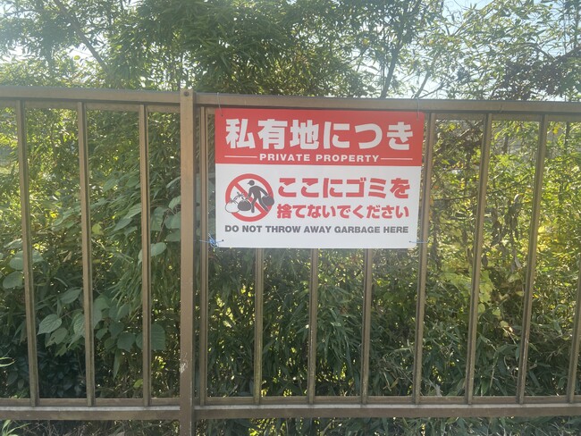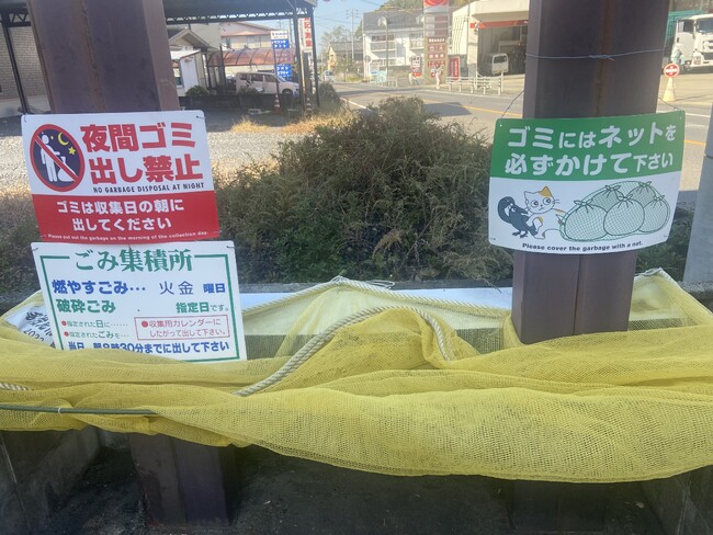 可愛らしいイラスト付きでゴミ捨て場のネット使用を呼びかけるプレート看板