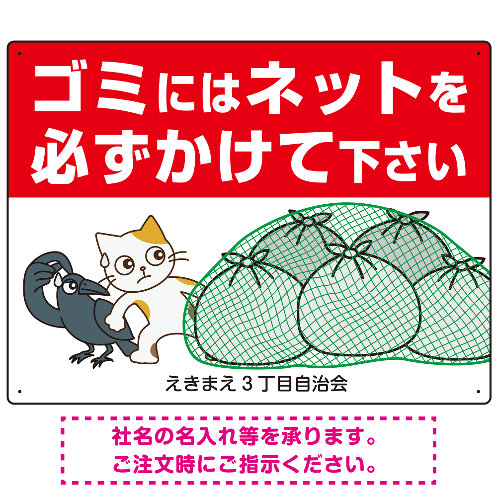 商品説明:ゴミにはネットをかけてください 困ったネコとカラスのイラスト付 プレート看板 レッド 600×450 エコユニボード (SP-SMD597-60x45U)