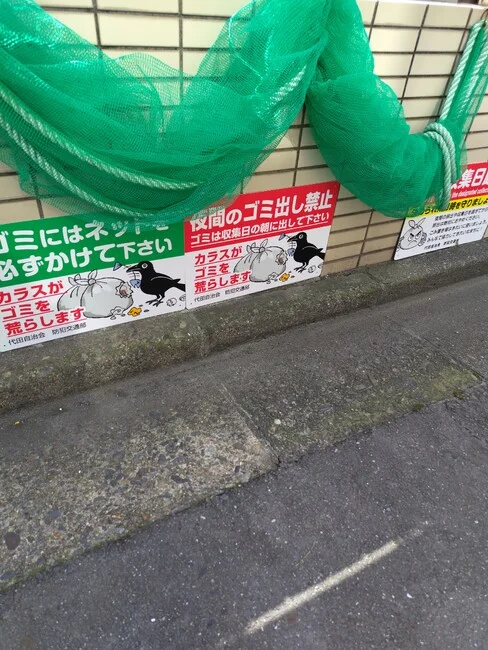 - ゴミを荒らすカラスのイラスト付きデザインで利用者に注意喚起を促します。
