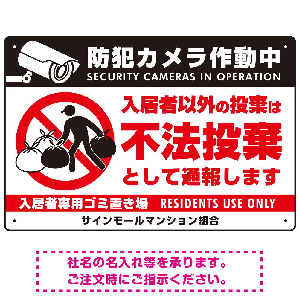 - 防犯カメラ作動中をしっかりアピールした上で、入居者以外のゴミ出しを禁止するプレート看板デザイン。