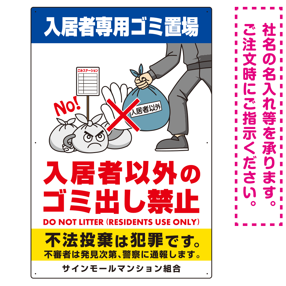 入居者専用ゴミ置き場 怒り顔ゴミイラストデザイン オリジナル プレート看板 タテ型 900×600 エコユニボード (SP-SMD620-90x60U)