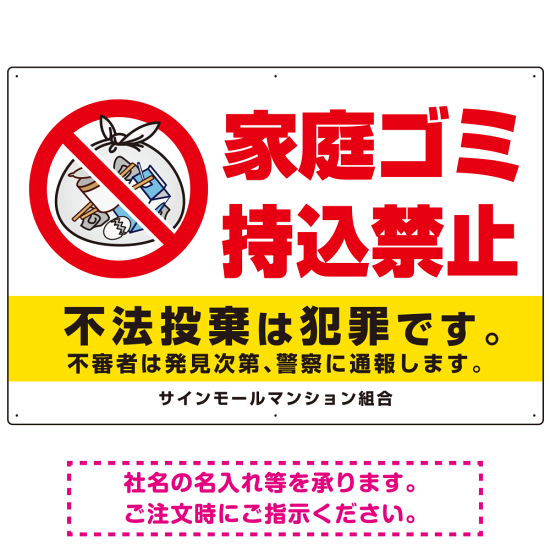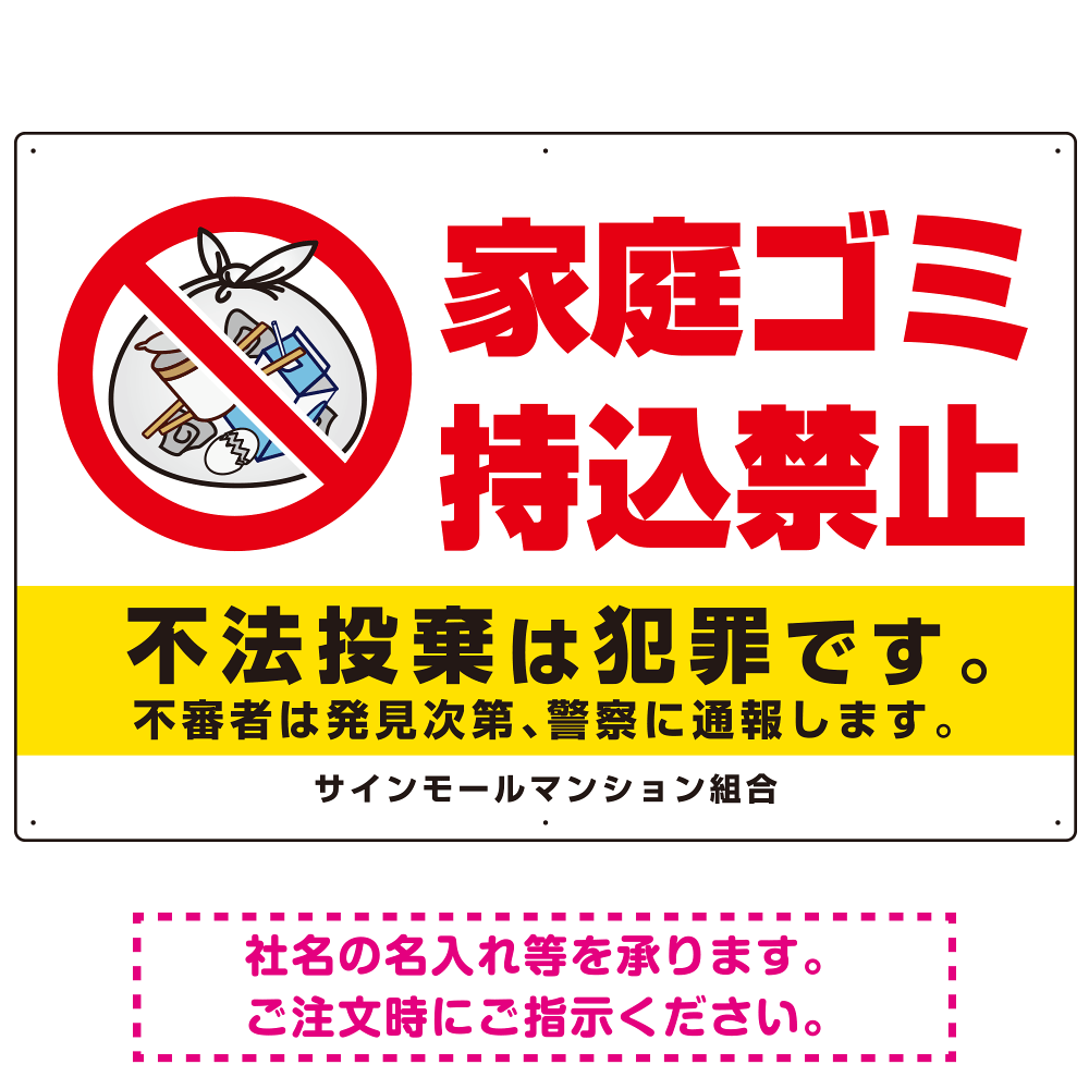 商品説明:家庭ゴミ持込禁止 The家庭ゴミの中身イラストデザイン オリジナル プレート看板 ヨコ型 900×600 エコユニボード (SP-SMD615-90x60U)
