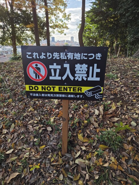 - 黒ベタ背景に白文字のコントラストがインパクトのある私有地への立入禁止看板。