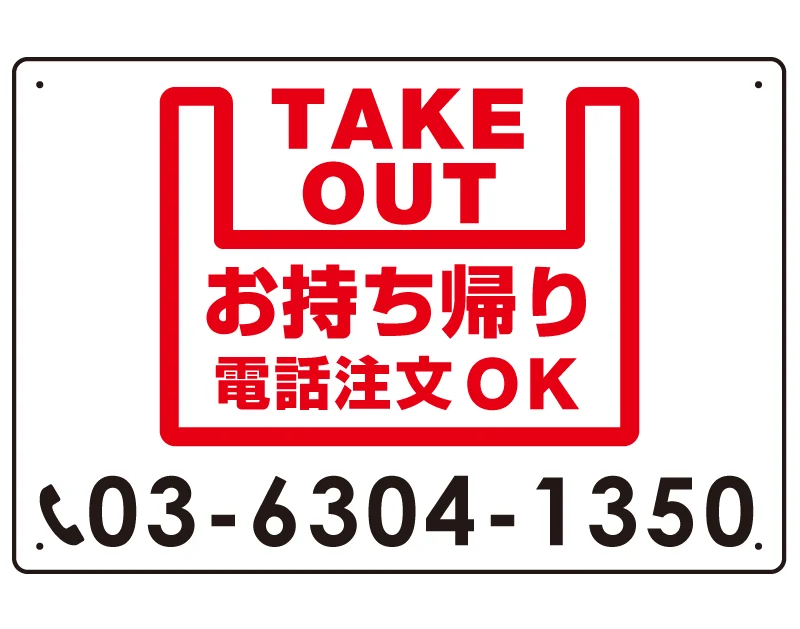 - 白地のプレートに赤文字のデザイン。電話注文もアピールする分かりやすいデザインです。電話番号をお客様店舗の番号に修正して製作いたします。