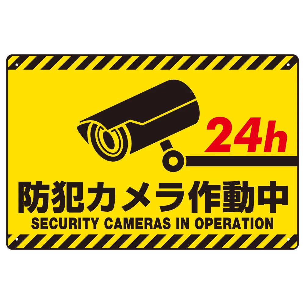 トラテープ柄の防犯カメラ作動中の表示プレート。敷地内に取り付けるだけでセキュリティ強化に繋がります。