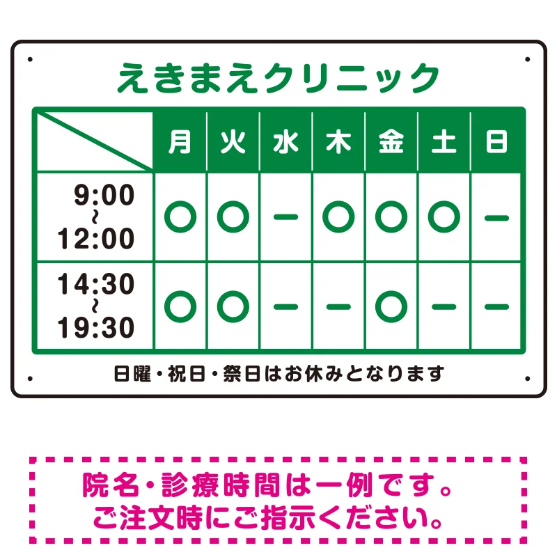 よくある質問:クリニック名付き診療時間案内 カラー文字・枠デザイン 病院・クリニック向けプレート看板 グリーン W450×H300 マグネットシート