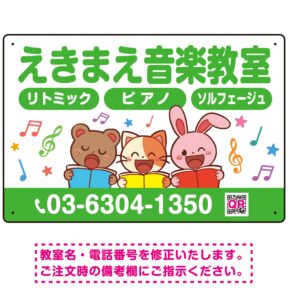 かわいい動物イラストが目を引く音楽教室 デザイン プレート看板 グリーン W450×H300 マグネットシート (SP-SMD490C-45x30M)