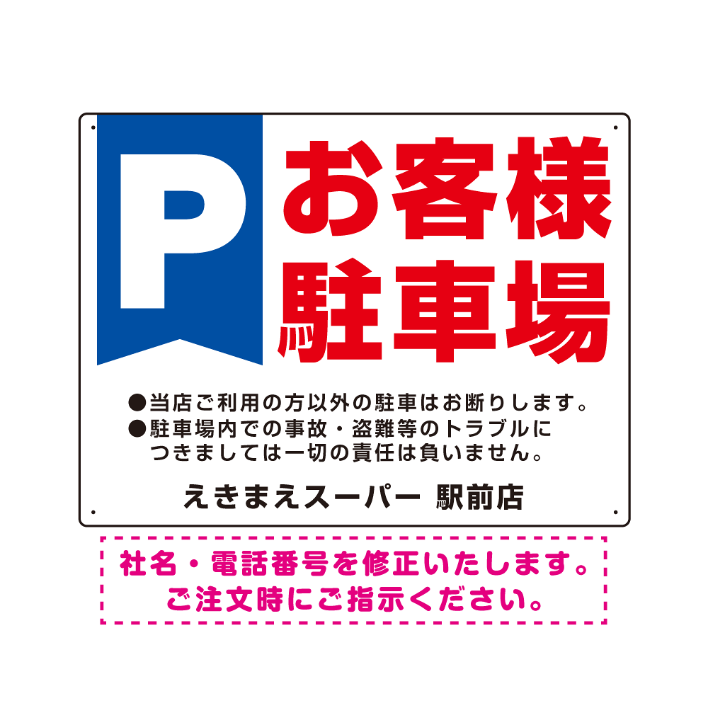 - 青字に白文字の「Pマーク」に赤字で「お客様駐車場」を大きく表示。