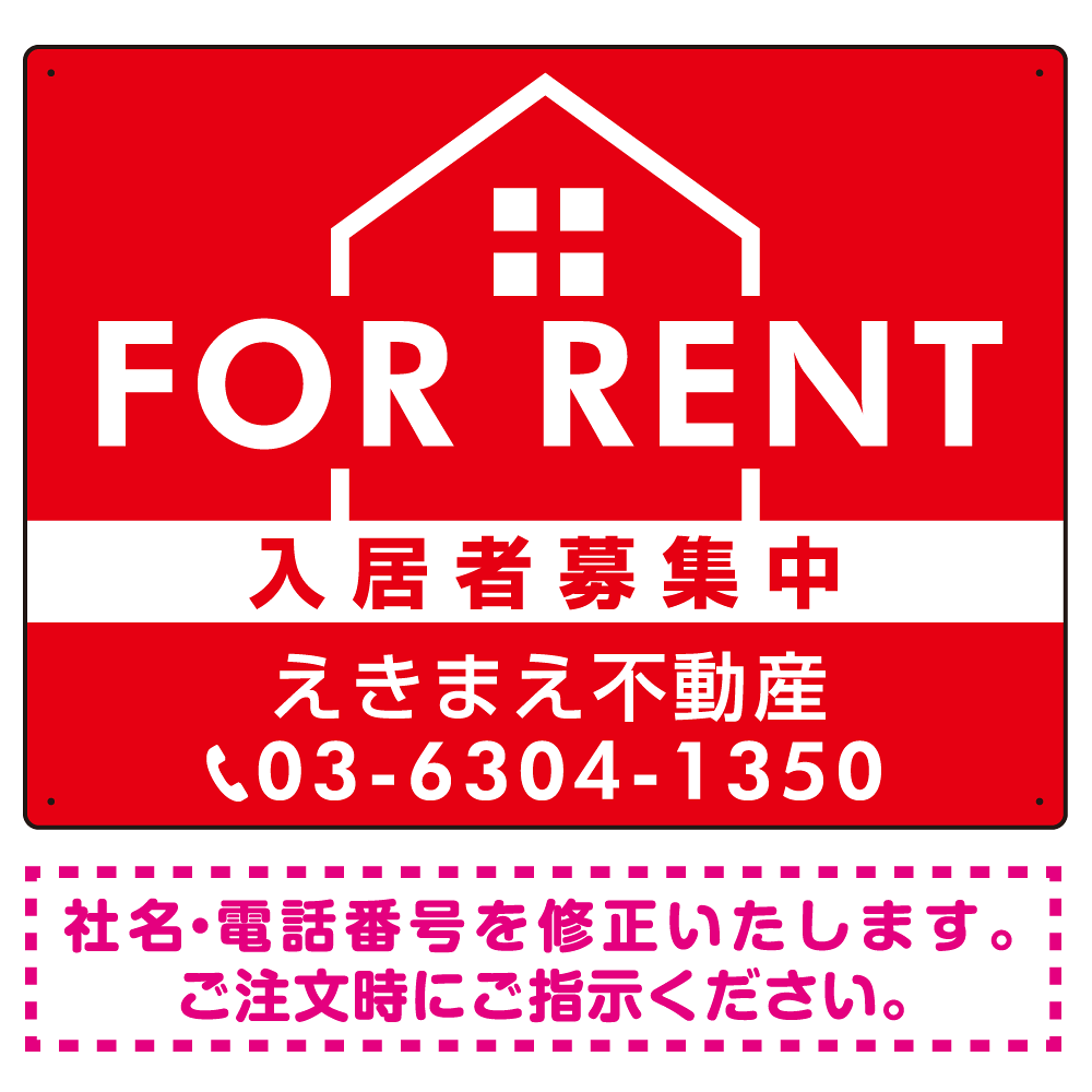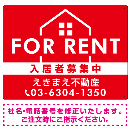 商品説明:FOR RENT 入居者募集中 ハウスイラスト付 赤地/白タイトル オリジナル プレート看板 W600×H450 マグネットシート (SP-SMD411B-60x45M)
