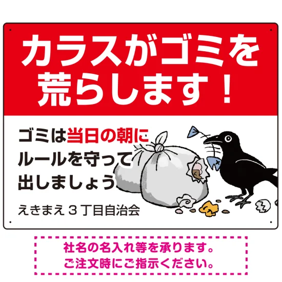 - カラスがゴミを荒らします イラスト付ゴミ捨て場注意表示 プレート看板 W600×H450 マグネットシート (SP-SMD591-60x45M)