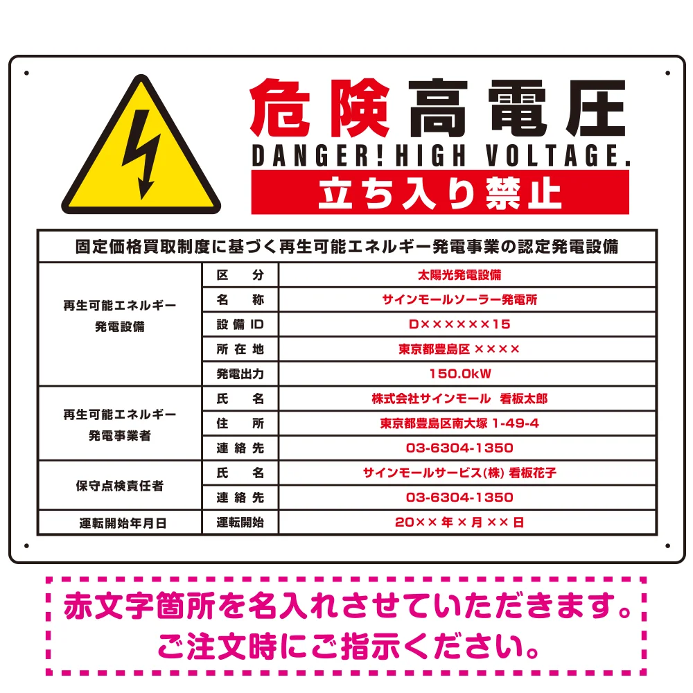 - 太陽光発電施設標識看板 改正FIT法対応 +高電圧表示付き プレート看板 【上】高電圧 W600×H450 アルミ複合板 (SP-SMD640C-60x45A)