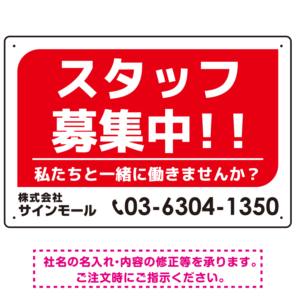 商品説明:スタッフ募集 私たちと一緒に働きませんか? シンプルデザイン 求人募集看板 オリジナル プレート看板 レッド W450×H300 エコユニボード (SP-SMD645A-45x30U)