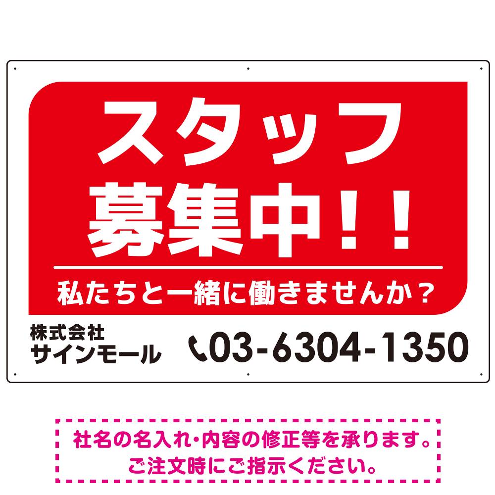 商品説明:スタッフ募集 私たちと一緒に働きませんか? シンプルデザイン 求人募集看板 オリジナル プレート看板 レッド W900×H600 エコユニボード (SP-SMD645A-90x60U)