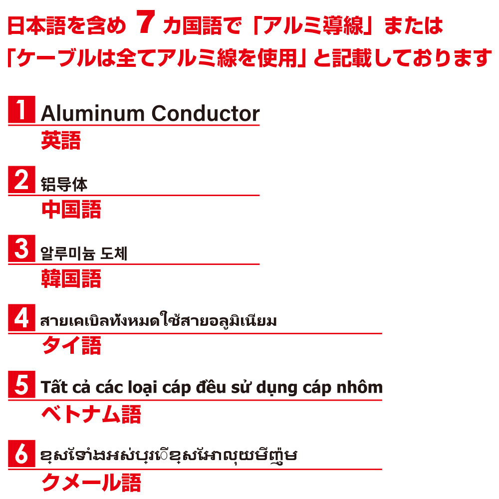 - 日本語を含め7カ国語(英語、中国語、韓国語、タイ語、ベトナム語、クメール語)で「アルミ導線」または「ケーブルは全てアルミ線を使用」と記載しております。