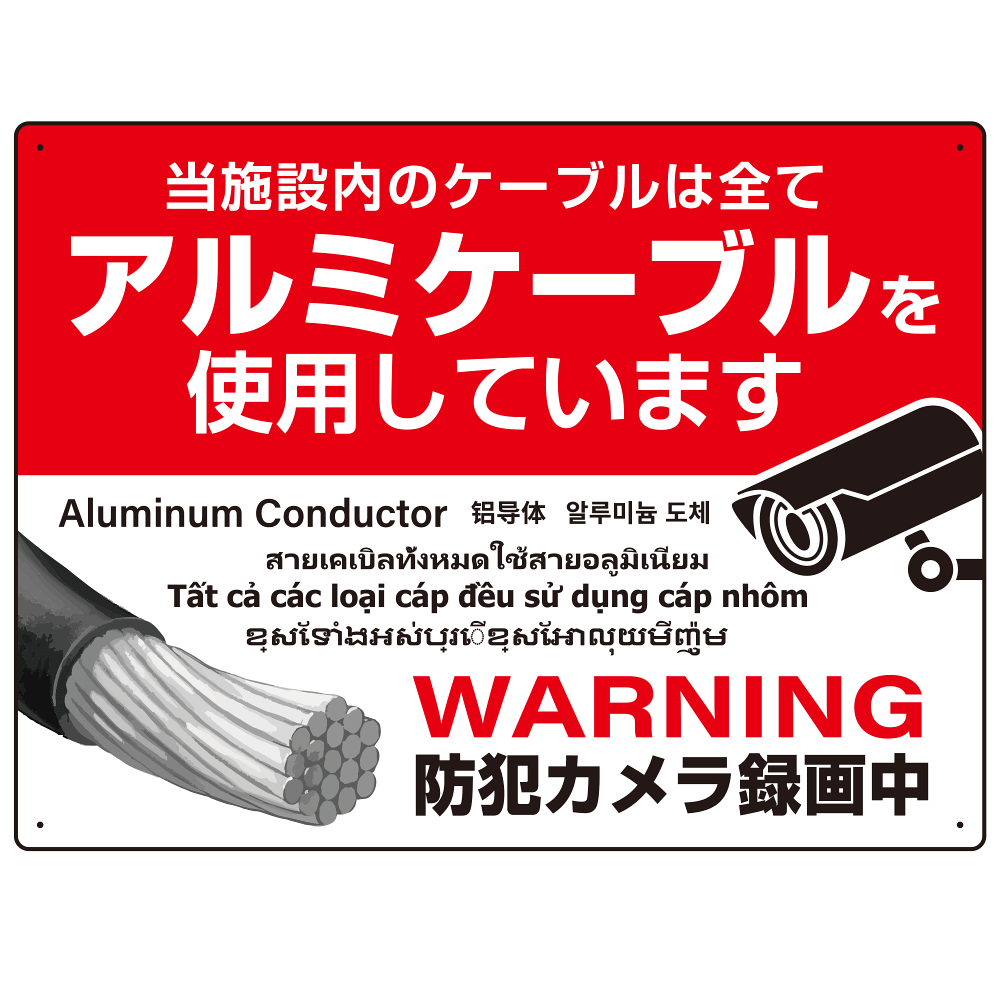 7カ国語対応 銅線盗難防止 アルミケーブル使用 警告デザイン オリジナル プレート看板 レッド W600×H450 アルミ複合板 (SP-SMD653-60x45A)