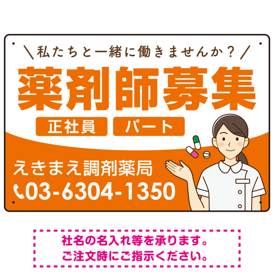 商品説明:薬剤師募集 女性イラスト付デザイン オリジナル プレート看板 オレンジ W450×H300 エコユニボード (SP-SMD656A-45x30U)