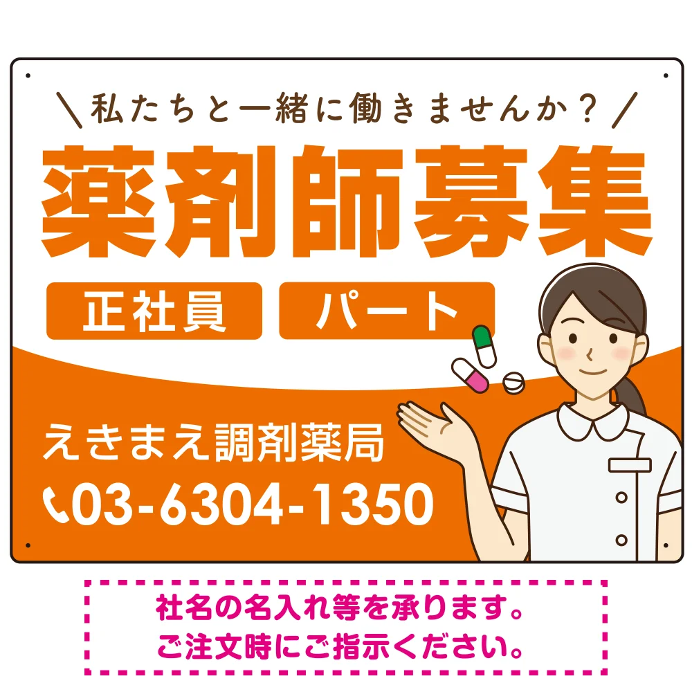 - 薬剤師募集 女性イラスト付デザイン オリジナル プレート看板 オレンジ W600×H450 アルミ複合板 (SP-SMD656A-60x45A)