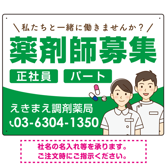 薬剤師募集 男女イラスト付デザイン オリジナル プレート看板 グリーン W600×H450 エコユニボード (SP-SMD658C-60x45U)