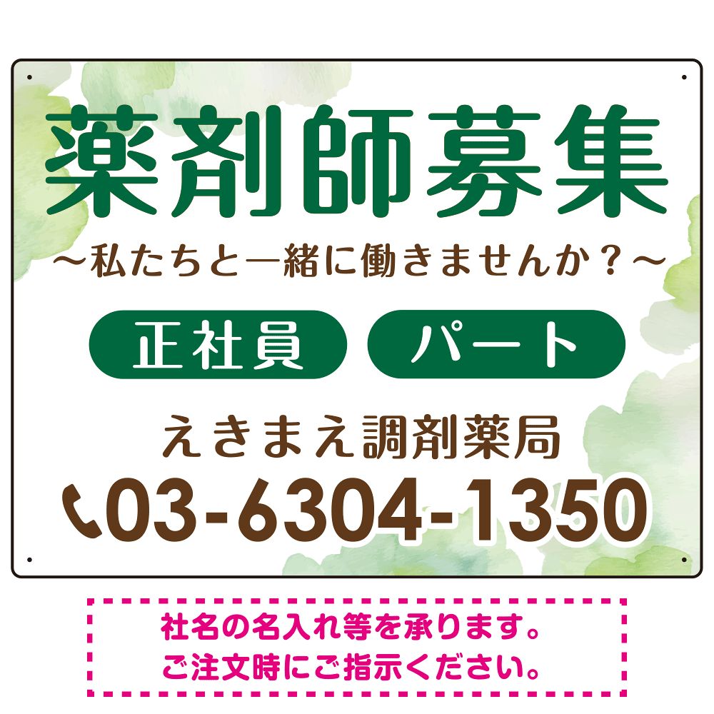 薬剤師募集 柔らかい雰囲気背景デザイン オリジナル プレート看板 グリーン W600×H450 エコユニボード (SP-SMD657C-60x45U)