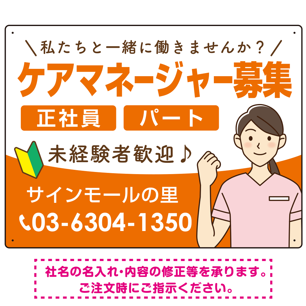 ケアマネジャー(介護支援専門員)募集 女性イラスト付デザイン オリジナル プレート看板 オレンジ W600×H450 エコユニボード (SP-SMD659A-60x45U)