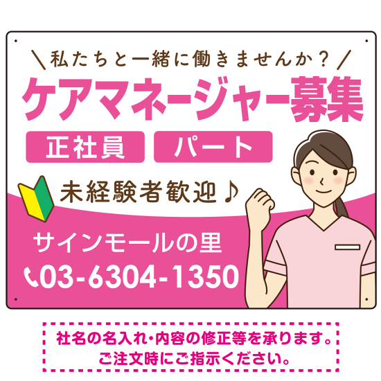 ケアマネジャー(介護支援専門員)募集 女性イラスト付デザイン オリジナル プレート看板 ピンク W600×H450 エコユニボード (SP-SMD659B-60x45U)