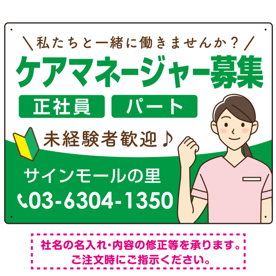 ケアマネジャー(介護支援専門員)募集 女性イラスト付デザイン オリジナル プレート看板 グリーン W600×H450 エコユニボード (SP-SMD659C-60x45U)