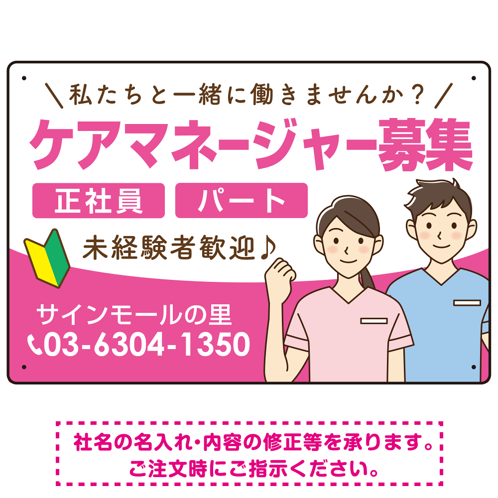 ケアマネジャー(介護支援専門員)募集 男女イラスト付デザイン オリジナル プレート看板 ピンク W450×H300 エコユニボード (SP-SMD661B-45x30U)