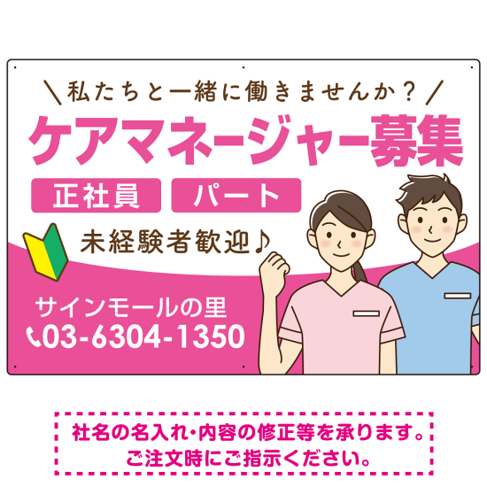 ケアマネジャー(介護支援専門員)募集 男女イラスト付デザイン オリジナル プレート看板 ピンク W900×H600 エコユニボード (SP-SMD661B-90x60U)