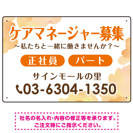 ケアマネジャー(介護支援専門員)募集 柔らかい雰囲気背景デザイン オリジナル プレート看板 オレンジ W450×H300 エコユニボード (SP-SMD660A-45x30U)