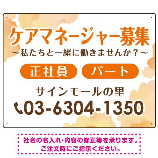 ケアマネジャー(介護支援専門員)募集 柔らかい雰囲気背景デザイン オリジナル プレート看板 オレンジ W600×H450 エコユニボード (SP-SMD660A-60x45U)