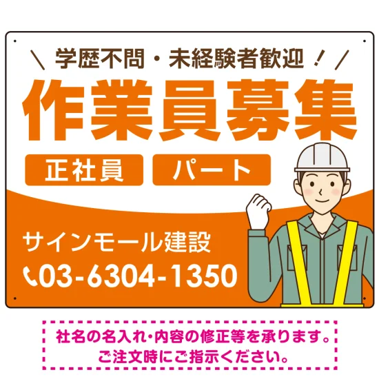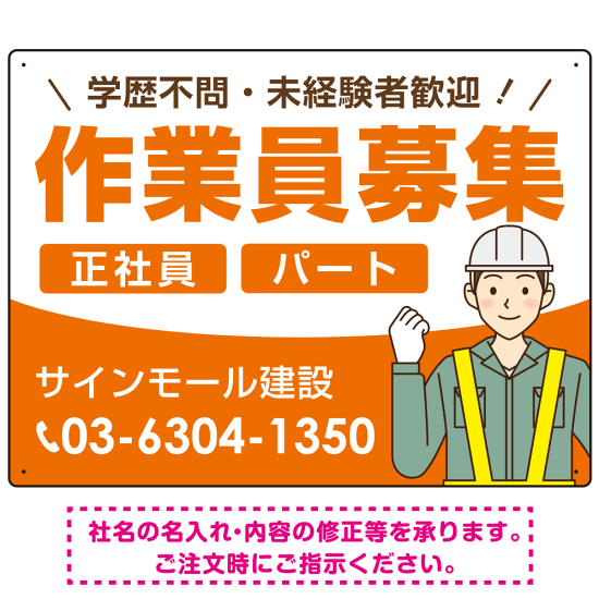 作業員募集 イラスト付デザイン オリジナル プレート看板 オレンジ W600×H450 エコユニボード (SP-SMD665A-60x45U)