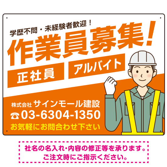作業員募集 男性イラスト付 斜行文字スタイルデザイン オリジナル プレート看板 オレンジ W600×H450 エコユニボード (SP-SMD666A-60x45U)