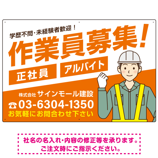 作業員募集 男性イラスト付 斜行文字スタイルデザイン オリジナル プレート看板 オレンジ W900×H600 エコユニボード (SP-SMD666A-90x60U)