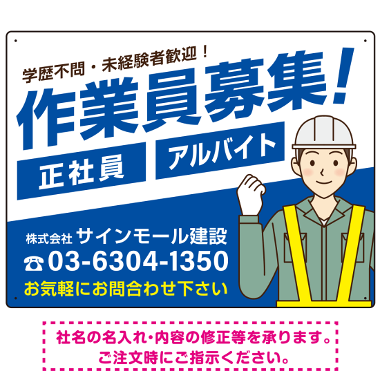 作業員募集 男性イラスト付 斜行文字スタイルデザイン オリジナル プレート看板 ブルー W600×H450 エコユニボード (SP-SMD666C-60x45U)