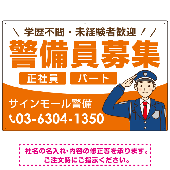 警備員募集 敬礼ポーズイラスト付デザイン オリジナル プレート看板 オレンジ W900×H600 エコユニボード (SP-SMD662A-90x60U)