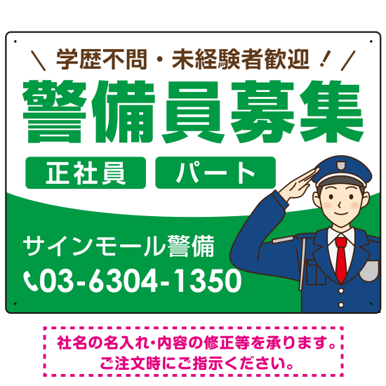 警備員募集 敬礼ポーズイラスト付デザイン オリジナル プレート看板 グリーン W600×H450 エコユニボード (SP-SMD662B-60x45U)