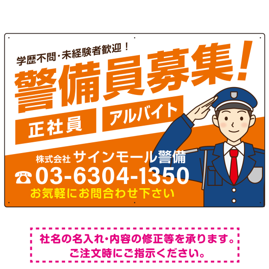 警備員募集 敬礼ポーズイラスト付 斜行文字スタイルデザイン オリジナル プレート看板 オレンジ W600×H450 エコユニボード (SP-SMD663A-60x45U)
