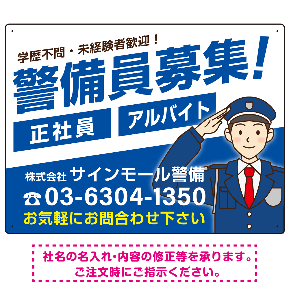 商品説明:警備員募集 敬礼ポーズイラスト付 斜行文字スタイルデザイン オリジナル プレート看板 ブルー W600×H450 アルミ複合板 (SP-SMD663C-60x45A)