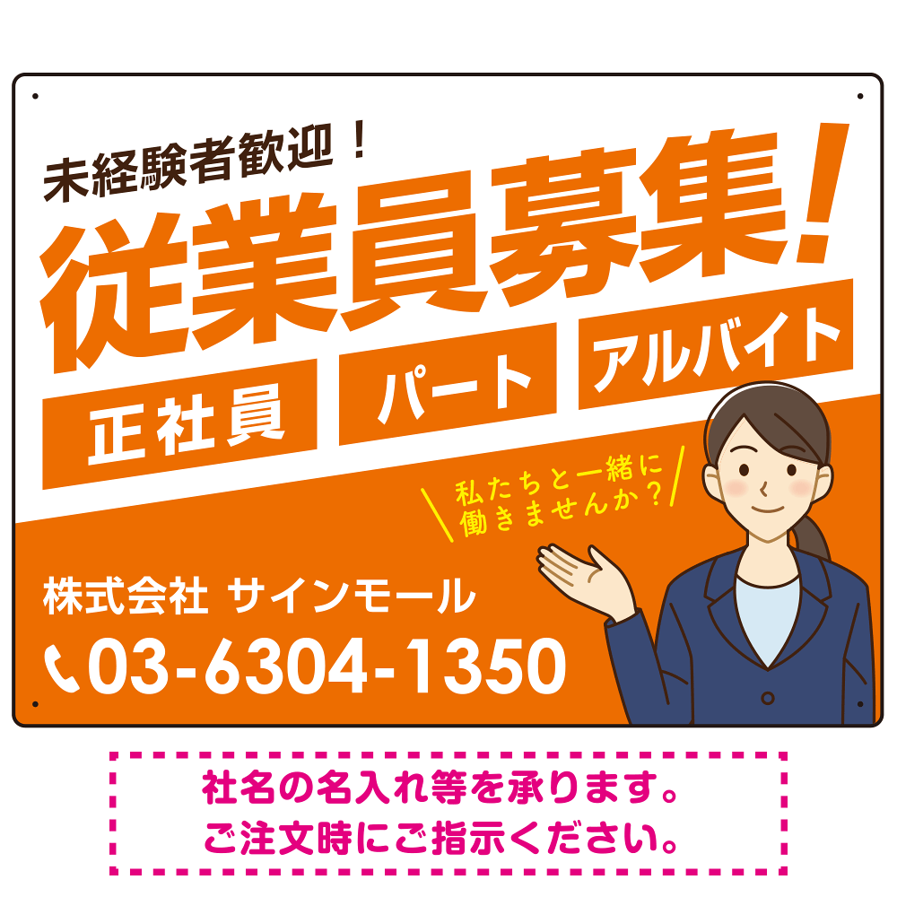 従業員募集 女性イラスト付 斜行文字スタイルデザイン オリジナル プレート看板 オレンジ W600×H450 マグネットシート (SP-SMD669A-60x45M)