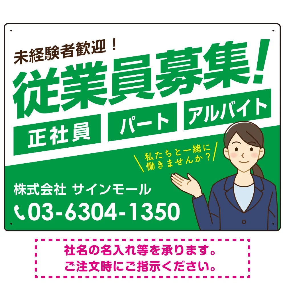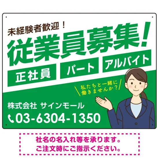 よくある質問:従業員募集 女性イラスト付 斜行文字スタイルデザイン オリジナル プレート看板 グリーン W600×H450 マグネットシート (SP-SMD669C-60x45M)