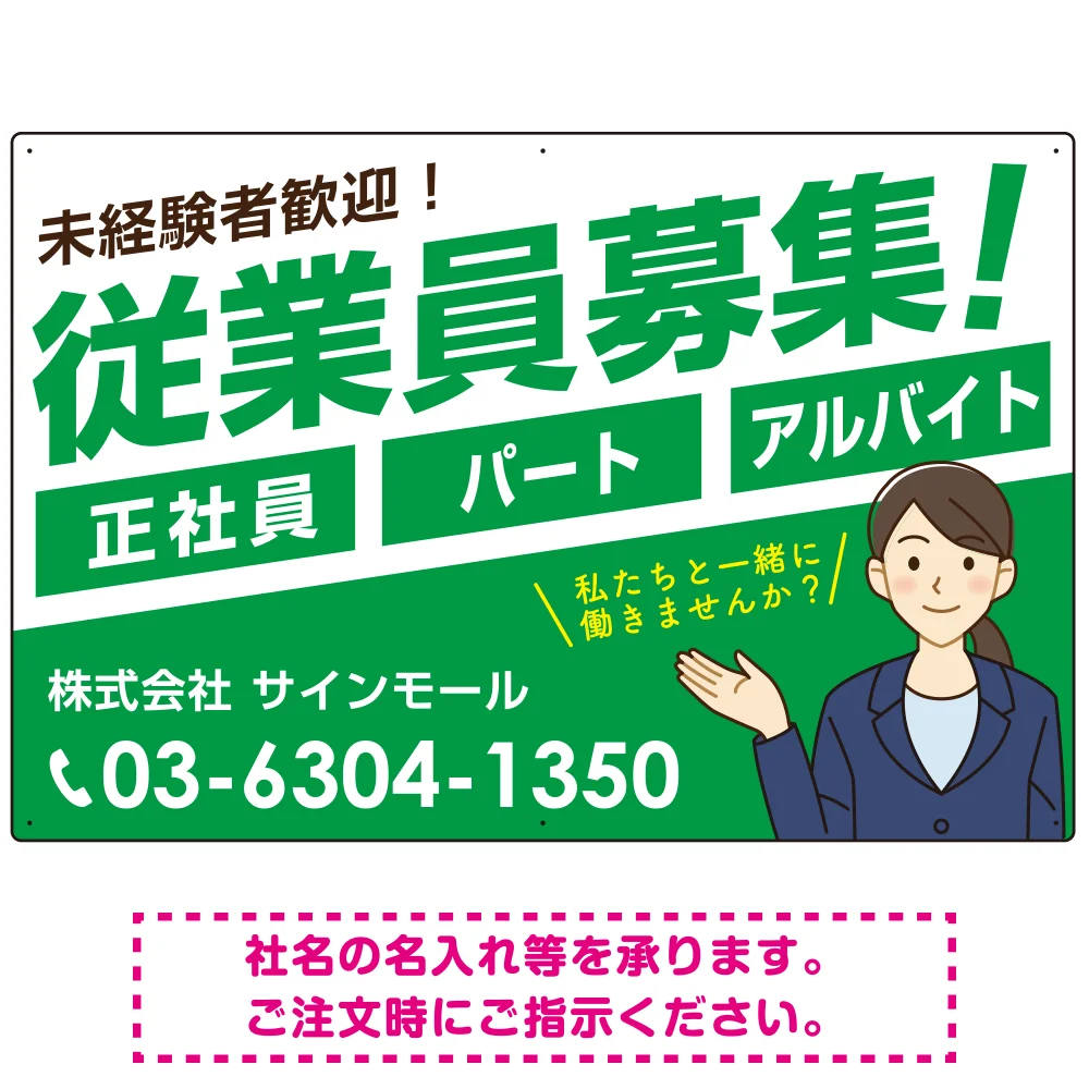よくある質問:従業員募集 女性イラスト付 斜行文字スタイルデザイン オリジナル プレート看板 グリーン W900×H600 マグネットシート (SP-SMD669C-90x60M)