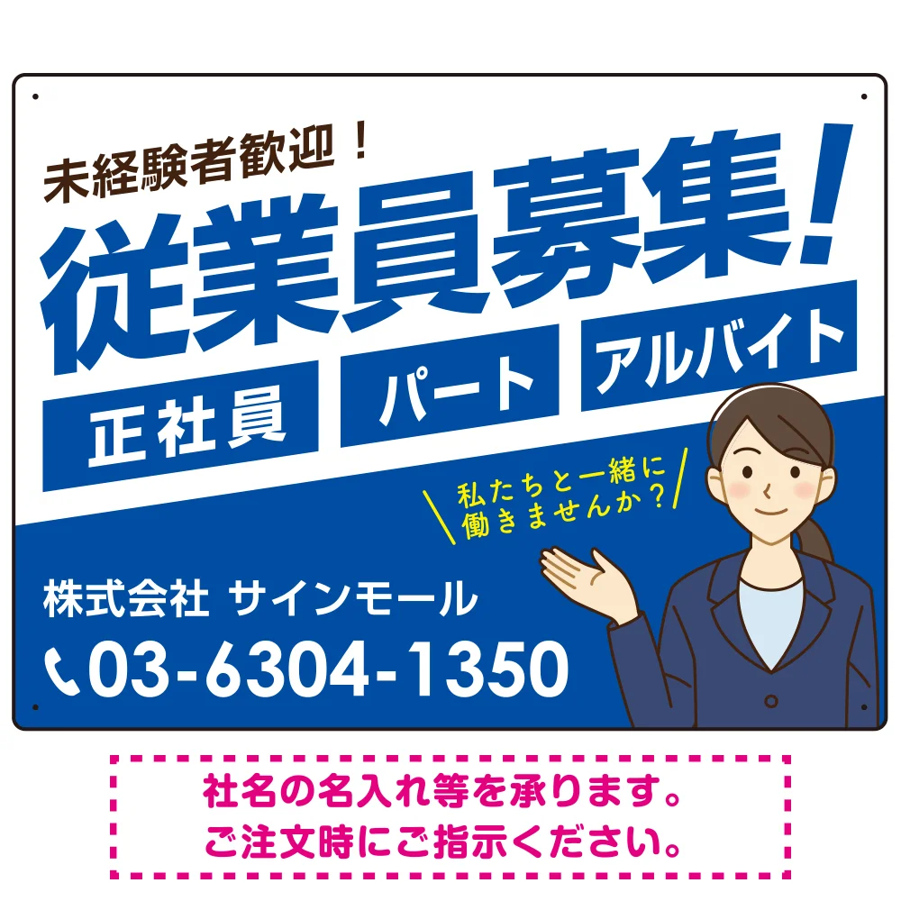 よくある質問:従業員募集 女性イラスト付 斜行文字スタイルデザイン オリジナル プレート看板 ブルー W600×H450 マグネットシート (SP-SMD669D-60x45M)