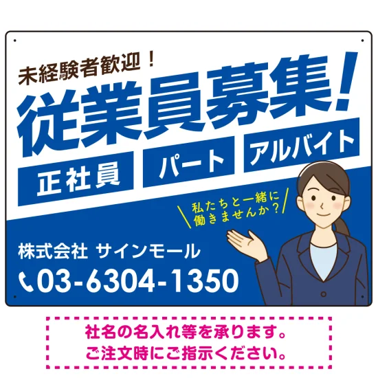 従業員募集 女性イラスト付 斜行文字スタイルデザイン オリジナル プレート看板 ブルー W600×H450 マグネットシート (SP-SMD669D-60x45M) の商品詳細