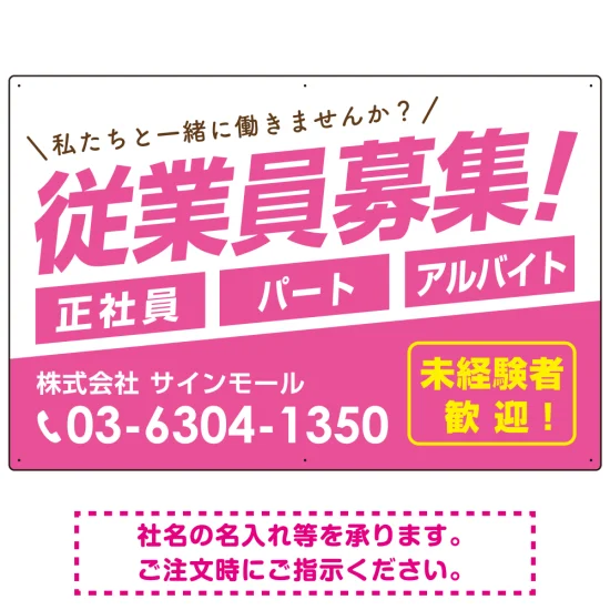 よくある質問:従業員募集 シンプル 斜行文字スタイルデザイン オリジナル プレート看板 ピンク W900×H600 アルミ複合板 (SP-SMD670B-90x60A)