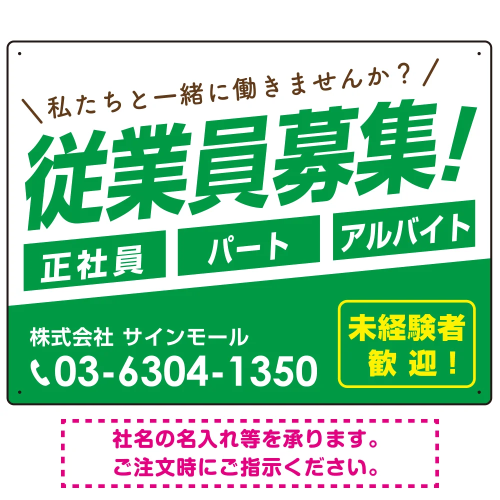 従業員募集 シンプル 斜行文字スタイルデザイン オリジナル プレート看板 グリーン W600×H450 エコユニボード (SP-SMD670C-60x45U) の商品詳細