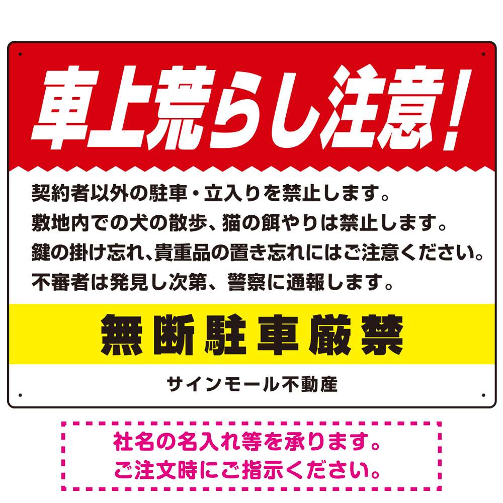 商品説明:車上荒らし注意 無断駐車厳禁 駐車場注意看板 オリジナル プレート看板 レッド W600×H450 エコユニボード (SP-SMD672A-60x45U)